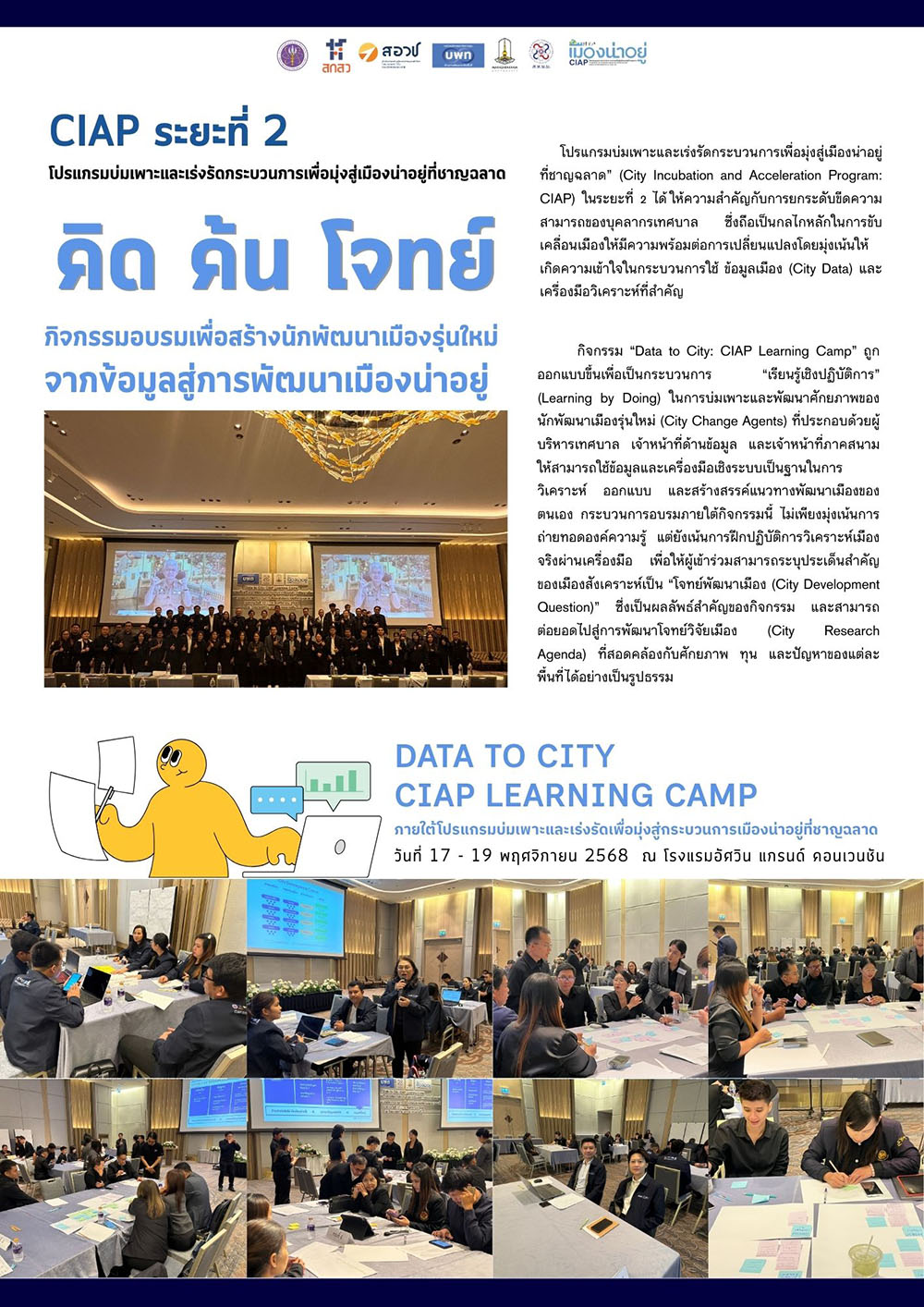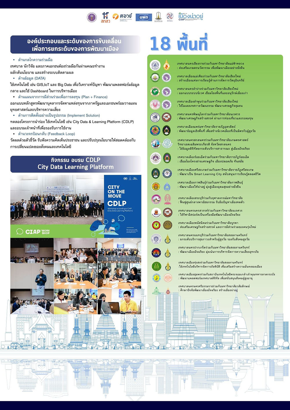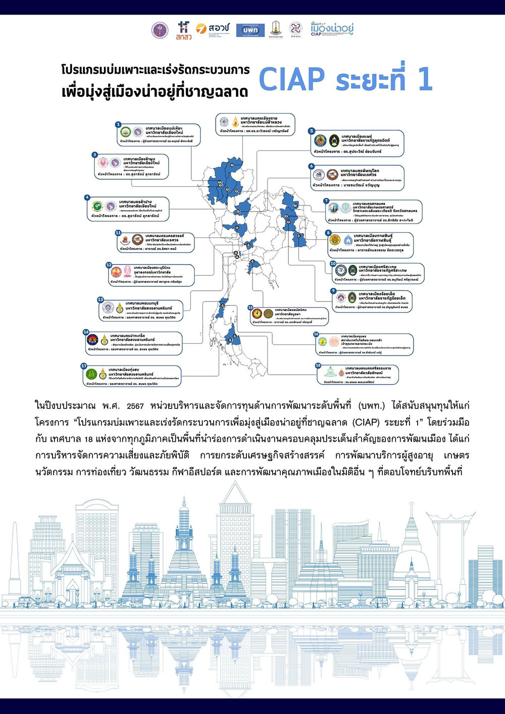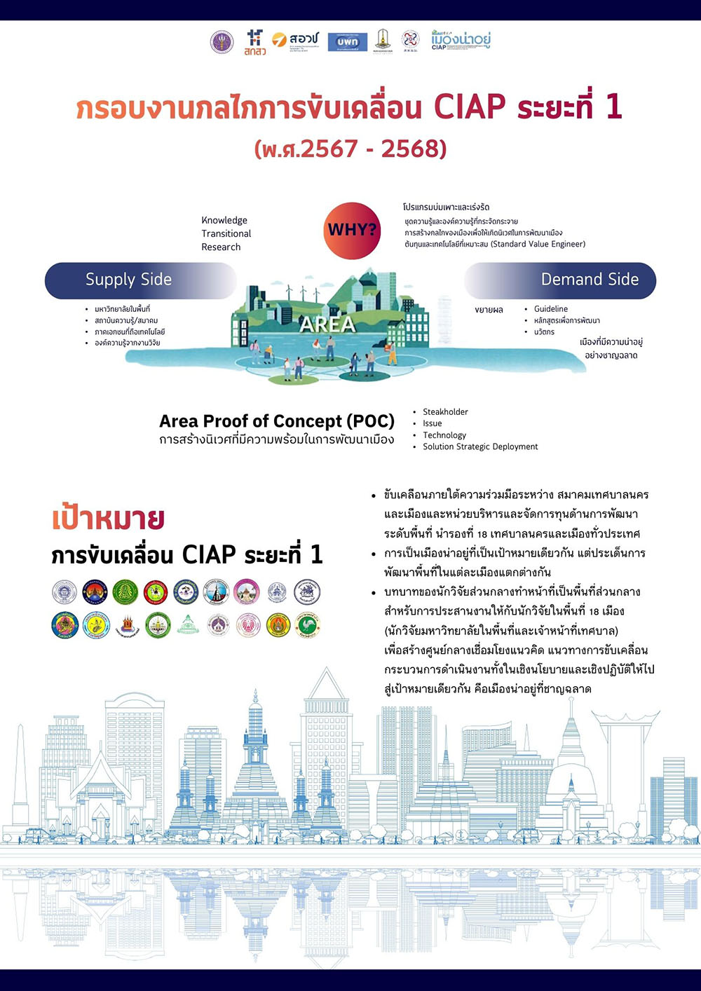 การขับเคลื่อนโครงการวิจัยสู่ท้องถิ่น ภายใต้ความร่วมมือของสมาคมเทศบาลนครและเมือง และหน่วยบริหาร และจัดการทุนด้านการพัฒนาระดับพื้นที่ โดยมีกรอบงานกลไกการขับเคลื่อน CIAP ระยะที่ 1 (พ.ศ.2567-2568) ร่วมกับเทศบาล 18 แห่งจากทุกภูมิภาคเป็นพื้นที่นำร่องการดำเนินงานครอบคุลมประเด็นสำคันสำคัญของการพัฒนาเมืองและ CIAP ระยะที่ 2 ให้ความสำคัญกับการยกระดับขีดความสามารถของบุคลากรเทศบาล จึงถือเป็นกลไกหลักในการขับเคลื่อนเมืองให้มีความพร้อมต่อการเปลี่ยนแปลงโดยมุ่งเน้นให้เกิดความเข้าใจในกระบวนการใช้ ข้อมูลเมือง (City Data) และเครื่องมือวิเคราะห์ที่ที่สำคัญผ่านการจัดกิจกรรมต่าง ๆ