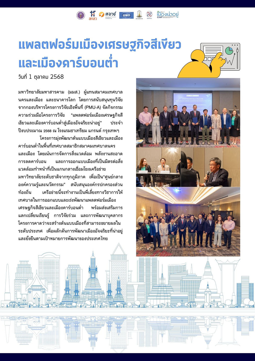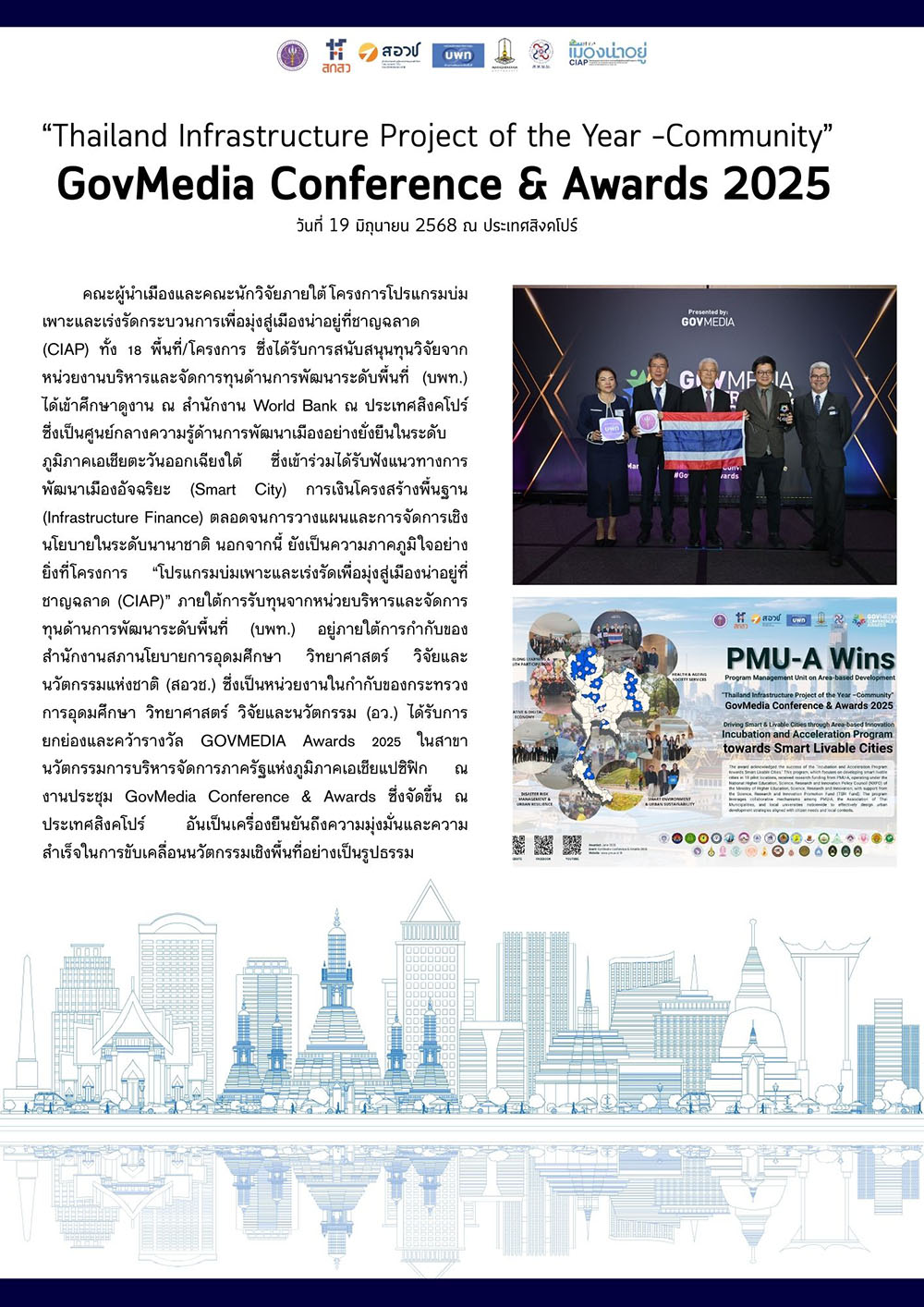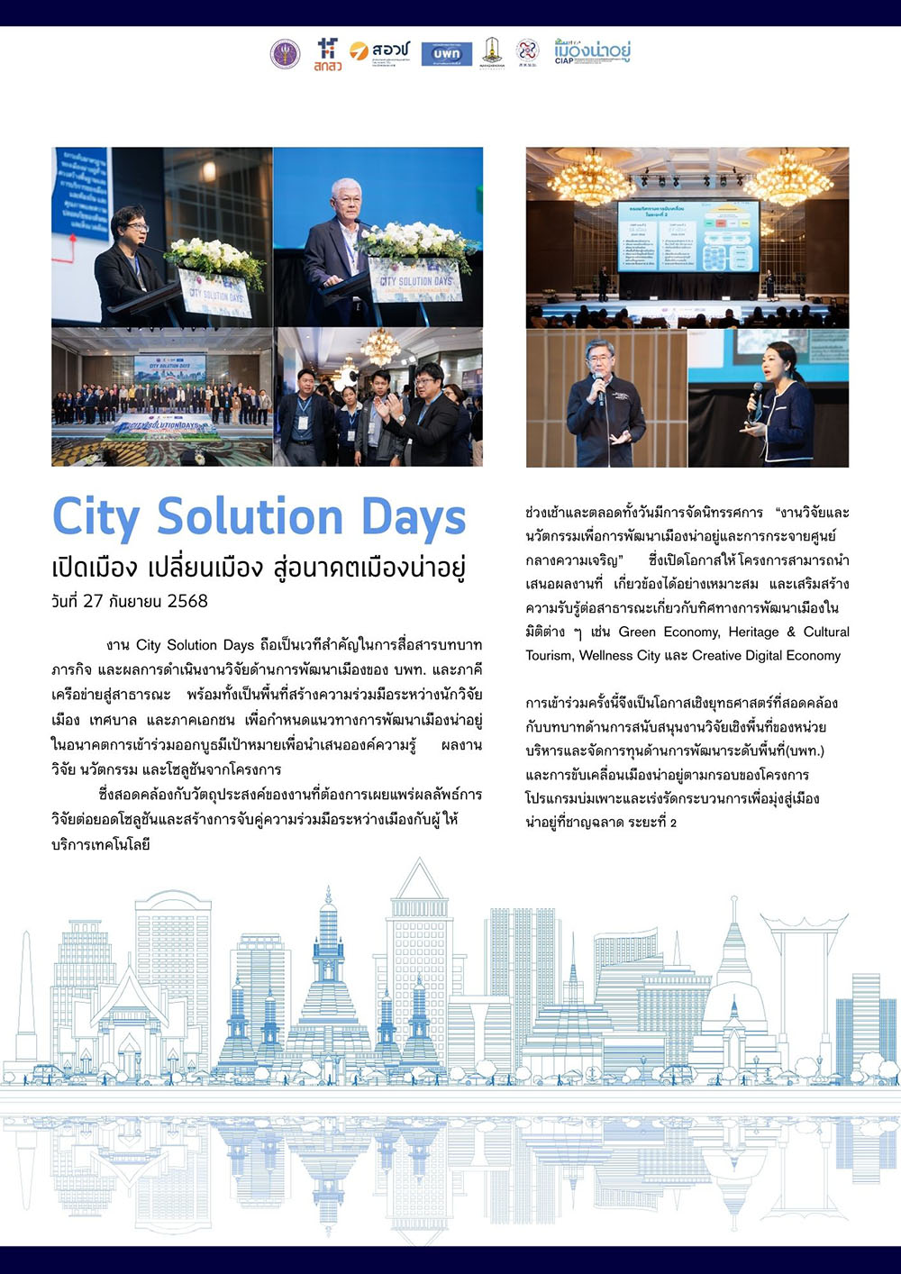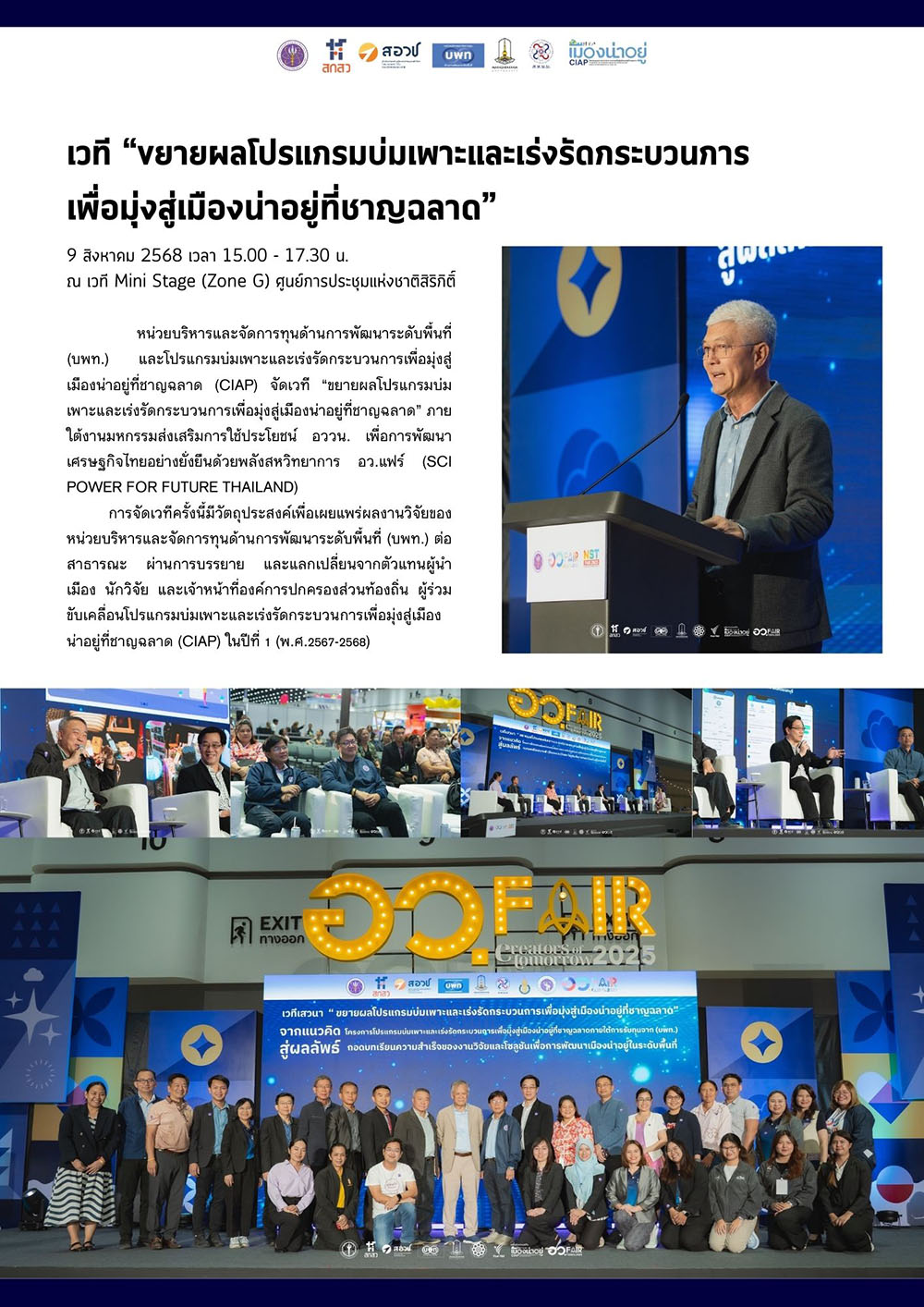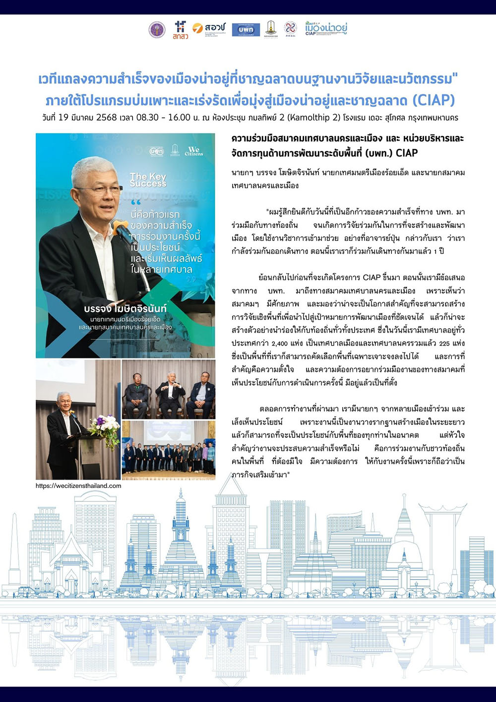 การขับเคลื่อนโครงการวิจัยสู่ท้องถิ่น ภายใต้ความร่วมมือของสมาคมเทศบาลนครและเมือง และหน่วยบริหาร และจัดการทุนด้านการพัฒนาระดับพื้นที่ โดยมีกรอบงานกลไกการขับเคลื่อน CIAP ระยะที่ 1 (พ.ศ.2567-2568) ร่วมกับเทศบาล 18 แห่งจากทุกภูมิภาคเป็นพื้นที่นำร่องการดำเนินงานครอบคุลมประเด็นสำคันสำคัญของการพัฒนาเมืองและ CIAP ระยะที่ 2 ให้ความสำคัญกับการยกระดับขีดความสามารถของบุคลากรเทศบาล จึงถือเป็นกลไกหลักในการขับเคลื่อนเมืองให้มีความพร้อมต่อการเปลี่ยนแปลงโดยมุ่งเน้นให้เกิดความเข้าใจในกระบวนการใช้ ข้อมูลเมือง (City Data) และเครื่องมือวิเคราะห์ที่ที่สำคัญผ่านการจัดกิจกรรมต่าง ๆ