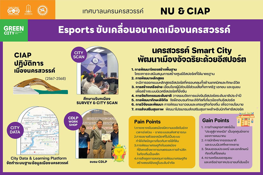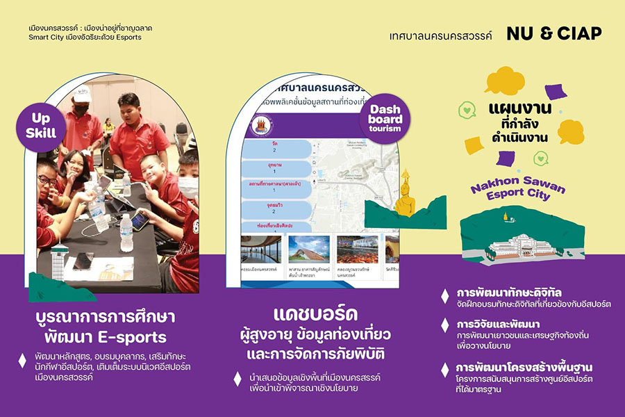 จากการดําเนินงานในช่วง 10 เดือนที่ผ่านมาของเทศบาลนครนครสวรรค์ นําโดย จิตตเกษมณ์ นิโรจน์ธนรัฐนายกเทศมนตรีนครนครสวรรค์ (ดํารงตําแหน่งนายกฯ ครั้งล่าสุด มีนาคม 2564 – มีนาคม 2568) ร่วมกับ มหาวิทยานเรศวรสนับสนุนโดย หน่วยบริหารจัดการทุนด้านการพัฒนาพื้นที่ (บพท.) ได้ดําเนินโครงการ โครงการเมืองนครสวรรค์ Smart City: การพัฒนาเมืองอัจฉริยะโดยมีกีฬาอีสปอร์ตเป็นต้นแบบและแรงขับเคลื่อน โดยมี ดร.อิศรา คงมี จากมหาวิทยาลัยนเรศวร เป็นหัวหน้าโครงการ : เกิดการดําเนินการ และผลลัพธ์การขับเคลื่อนเมืองน่าที่ชาญฉลาด (CIAP) ผ่านประกอบด้วย